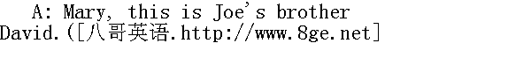 玛丽,这是乔的兄弟戴维.) B: I'm very glad to meet you.( 认识你很高兴.) C: It's pleasure to meet you.( 幸会,幸会.) B: How do you like Texas so far?( 这些天来,你觉得得萨斯州怎么样?) C: It's really different from what I expected.( 确实和我想象的不一样.)