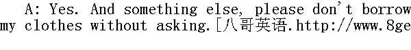 是的。还有一件事,没问过我,请别拿我的衣服。 B: Sorry, I guess I wasn't thinking. I won't do it again. 对不起。我对这事没想过,下次不这样了。 A: You don't have to play that record/CD so loud, do you? 你不一定要把唱片放得那么响,对吧? B: I'm sorry. Has it been bothering you? 对不起,打扰你了? A: Yes. And please ask me the next time you want to use something. 是的。另外,如果下次要用什么东西,请先问我一声。