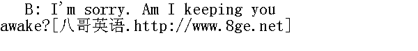 对不起。我吵得你睡不着了吗? A: Yes. And another thing, would you mind not making long distance calls? 是的。还有一件事,请你别打长途电话了,好吗? B: I'm sorry. I thought you wouldn't mind. 对不起,我还以为你不在乎呢。 A: That radio's pretty loud. Could you turn it down, please? 收音机太响了,你能把声音开小一点吗? B: Sorry. Was I disturbing you? 对不起,我刚才打扰你了吗?