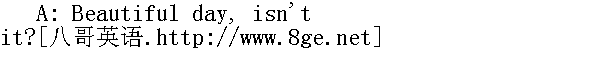 今天天气真好,是不是? B: Yes, it's not like what the radio said at all. 是的,一点也不像收音机里说的那样。 A: I wish it would stay this way for the weekend. 但愿整个周末都能保持这样的好天气。 B: As long as it doesn't snow! 只要不下雪就行啊! A: It seems to be clearing up. 看来天要放晴了。