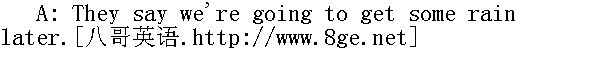 据说待会儿要下雨。 B: Oh, let's just hope it stays warm. 哦,我只希望一直暖和下去。 A: I think it's going to be a nice day. 我想今天会是一个好天。 B: It's certainly a big improvement over yestterday. 肯定比昨天大有好转。 A: But it's supposed to get cloudy and windy again this afternoon. 但是,据说今天下午又要转阴刮风了。