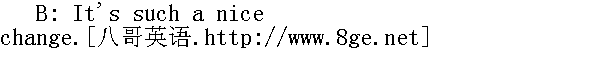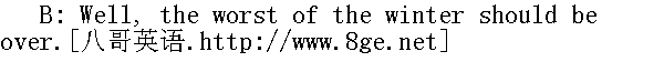 真实令人高兴的转变。 A: I really don't think this weather will last. 我确实认为这样的好天长不了。 B: Let's just hope it doesn't get cold again. 但愿不会再冷。 A: It looks like it's going to be sunny. 今天看来像是个晴天。 B: Yes, it's much better than yesterday. 是的,比昨天好多了。