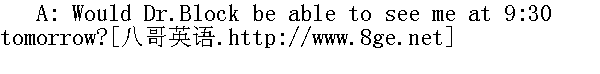 12点45分怎么样? B: Sorry, but she's busy then too. 对不起,那会儿她也没空。 A: Do you think the doctor could see me tomorrow before 9:30? 你看医生在明天9:30前能给我看病吗? B: She won't be in until 10:45, so the earliest would be 11:00. 她要到10:45才来,所以最早也得到11点才能看。 A: How would 12:45 be?12:45 怎么样?