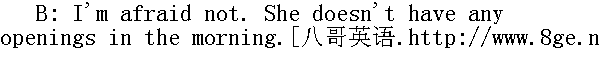 恐怕不行。上午她没有空。 A: Could I possibly make it early in the afternoon? 我可以约在下午一上班的时间吗? B: No. That's nog good either. But give me your number and I'll call you if somebody cancels. 不。也不行。不过请你把电话号码给我,如果友人取消约会,我就打电话通知你。 A: I wonder if the dentist could fit me in early tomorrow? 请问明天一早牙科医生能抽空给我看一下吗? B: I'm afraid there's nothing available before noon. 恐怕中午前是没法看了。