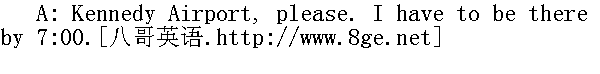 请到肯尼迪机场。我得在7点前赶到那儿。 B: I can't promise anything,but I'll do my best. 不敢保证,不过我尽力而为。 A: OK. That'll be $12.00, please. 到了。请付12元。 B: Thanks a lot. Here. 多谢。这是车费。 A: Do you think you can get me to Union Station by quarter after? 你看你能否在一刻前把我送到联合车站?