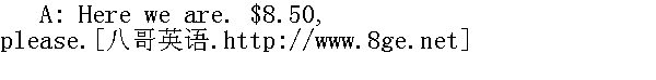 我们到了。请付8元5角。 B: Thank you. Here's $10:00. Keep the change. 谢谢你。这是10元,不用找了。 A: Grand Central Station, please. I want to try to catch a 6:00 train. 请到中央火车站。我要赶6点的火车。 B: I think you'll make it if we don't get stuck in a traffic jam. 我想,如果我们不碰上交通阻塞,你是可以赶到的。 A: This is it. That's $9.15, please. 到了。请付9元1角5分。