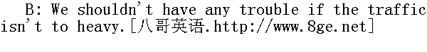 如果交通不太拥挤的话,我们不会有什么困难。 B: You've got plenty of time. That's $7.65. 你还富有很多时间.请付7元6角5分。 A: Thank you very much. Here's $10.00. Give me $1.00 back, please. 太谢谢你了。这是10元钱,找我1元就行了。 A: The Hilton hotel, please. I have a 10:30 appointment. 请到希尔顿旅馆,10点半我有一个约会。 B: You'll be there in plenty of time. 你可以很方便地到达那里。
