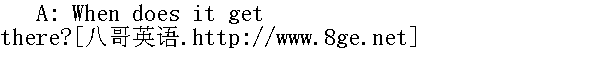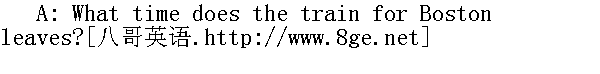 去波士顿的火车几点开? B: 9:25 on Track 12. 9点25分,12轨道。 A: When does it arrive? 什么时候到那儿? B: It should be there at 11:45, but it may be a little late. 应该是11点45分到那里,但也可能稍晚一点。 A: How much is a one-way ticket? 单程车票多少钱一张?