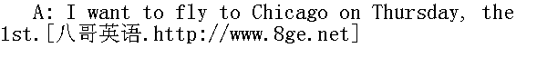 我要在1号,星期四飞往芝加哥。 B: Let me see what's available. 我查一查看有什么班机。 A: I want to go coach, and I'd prefer a morning flight. 我要普通舱,还有,我喜欢早上的班机。 B: United's Flight 102 leaves at 9:20. 联合公司的102次班机9点20分起飞。 A: That's fine. What time do I have to be at the airport? 好的。我应该几时到达机场?