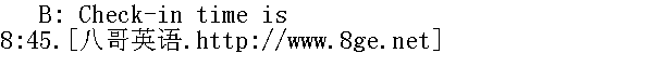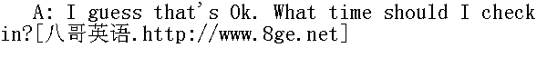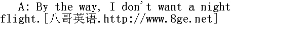 随便提一下,我不要夜航班机。 B: There's a DC-10 out of LaGuardia Airport at 9:15 A.M. 上午9点15分有班DC-10号班机从拉瓜迪亚机场起飞。 A: When am I supposed to check in? 我应该在什么时候到机场办理手续呢? B: Try to be there by 8:15----the airport will be crowded. 尽量在8点15分以前赶到那里,到时机场会很拥挤的。