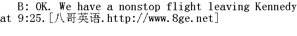 好的。9点25分有一趟直达班机,从肯尼迪国际机场起飞。 B: When should I get to the airport? 我该在什么时候到达机场? A: Please be there by 8:45 at the latest. 最迟请在8点45分之前到那里。 A: Do you fly to Dallas on Sunday? 星期日你们有班机去达拉斯吗? B: Just a minute and I'll see if there are any flights. 等一下,我来看看有没有班机。