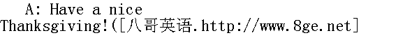 感恩节快乐!) B: Same to you!( 也祝你快乐!) A: Are you going anywhere?( 你打算上哪儿去玩?) B: I thought about going to my sister's. How about you?( 我想去姐姐家玩.你呢?) A: Oh, I'll probably[ 几乎肯定;很可能;大概]just stay home.(哦,我可能就呆在家里了.)