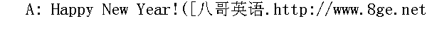 新年快乐!) B: Thank you! Same to you.( 谢谢.你也一样.) A: Have you got any plans?( 你有什么计划吗?) B: I've bee invited over[ 邀请]to a friend's. And you?(有个朋友请我去作客.你呢?) A: My roommate's having a party.( 我的室友安排了一个聚会.)