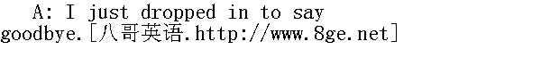 我只是来告别的。 B: What time are you leaving? 你几点钟走? A: I'm going to try to leave by 10:00. 我争取10点以前离开。 B: Take care and give my by best to your parents. 多保重,代我向你的父母问候。 A: Goodbye. Hope to see you again next year. 再见。希望明年再见到你。