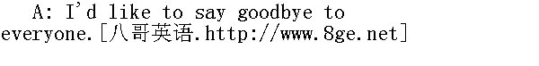 我要向诸位告别了。 B: What time are you going? 你什么时候走? A: My plane leaves at 7:25. 我乘的飞机7点25分起飞。 B: Well, goodbye and have a good trip! 那么,再见,祝你一路顺风。 A: Goodbye. Remember to look me up if you're ever in Washington. 再见。要是你光临华盛顿的话,别忘了来看我。