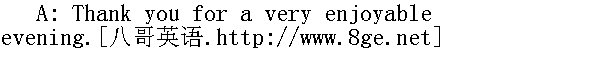 谢谢你,今晚过得真愉快。 B: Don't mention it. I hope you can come again soon. 不用谢,希望你不久能再来。 A: I really should be on my way. 我真的该告辞了。 B: Oh, not yet! At least have one for the road. 哦,还不到时候,至少再喝一杯,以表送行。 A: No. Thanks all the same. 不喝了。不过还是得谢谢你。