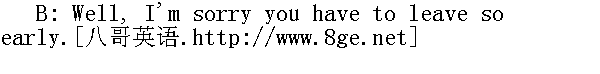 我得告辞了。 B: So soon? Why don't you stay a little longer? 这么早就走了?为什么不呆一会呢? A: I wish I could, but it's already late. 我是想多呆一会儿,但是时间已经很晚了。 B: Oh, it's a shame that you have to leave. 哦,真遗憾,你非走不可呀。 A: Thank you for a wonderful meal. 谢谢你的美餐。