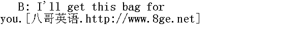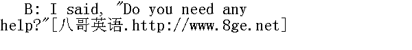 我是说:"你需要帮忙吗?" A: That's very nice of you. I guess I could use some help. 谢谢你的好意。我想我可能要一点帮助。 B: Just tell me what you'd like me to do. 你要我做什么就请你吩咐吧。 A: What was that? 你说什么来着? B: I said, "Is there anything I can do?" 我是说:"我能为你做点什么吗?"