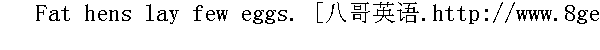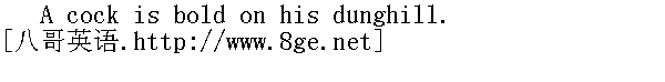 站在粪堆上,公鸡也称王。 A barley-corn is better than a diamond to a cock. 对一只公鸡来说,一颗麦粒优于一颗钻石。 He that will have his farm full,must keep an old cock and a young bull. 想使农庄充裕,就得养一只老公鸡和一头小公牛。 If the hen does not prate,she will not lay. 不叨叨的母鸡不下蛋。 It is no good hen that cackles in your house and lays in another's. 这样的母鸡可不好:在你家里咯咯叫,却到别家去下蛋。