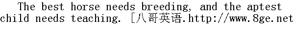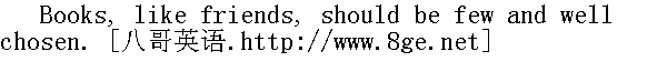 读书如择友,宜少且宜精。 A book that remains shut is but a block. 书本不常翻,犹如一块砖。 It's not the gay coat that makes the gentleman. 君子在德不在衣。 Two heads are better than one. 三个臭皮匠顶个诸葛亮。 Birth is much, but breeding is more. 出身重要,教养更重要。