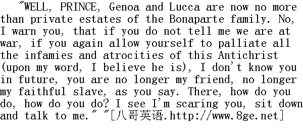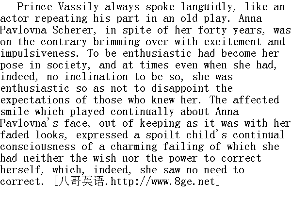 啊,公爵,热那亚和卢加现在是波拿巴家族的领地,不过,我得事先对您说,如果您不对我说我们这里处于战争状态,如果您还敢袒护这个基督的敌人(我确乎相信,他是一个基督的敌人)的种种卑劣行径和他一手造成的灾祸,那么我就不再管您了。您就不再是我的朋友,您就不再是,如您所说的,我的忠实的奴隶。啊,您好,您好。我看我正在吓唬您了,请坐,讲给我听。" These words were uttered in July 1805 by Anna Pavlovna Scherer, a distinguished lady of the court, and confidential maid-of-honour to the Empress Marya Fyodorovna. It was her greeting to Prince Vassily, a man high in rank and office, who was the first to arrive at her soiree. Anna Pavlovna had been coughing for the last few days; she had an attack of la grippe, as she said-grippe was then a new word only used by a few people. In the notes she had sent round in the morning by a footman in red livery, she had written to all indiscriminately: 一八○五年七月,遐迩闻名的安娜·帕夫洛夫娜·舍列尔--皇后玛丽亚·费奥多罗夫娜的宫廷女官和心腹,在欢迎首位莅临晚会的达官显要瓦西里公爵时说过这番话。安娜·帕夫洛夫娜一连咳嗽几天了。正如她所说,她身罹流行性感冒(那时候,流行性感冒是个新词,只有少数人才用它)。清早由一名红衣听差在分别发出的便函中,千篇一律地写道: "If you have nothing better to do, count (or prince), and if the prospect of spending an evening with a poor invalid is not too alarming to you, I shall be charmed to see you at my house between 7 and 10. Annette Scherer." " 伯爵(或公爵),如您意下尚无任何可取的娱乐,如今日晚上这个可怜的女病人的症候不致使您过分惧怕,则请于七时至十时间莅临寒舍,不胜雀跃。安娜·舍列尔。" "Heavens! what a violent outburst!" the prince responded, not in the least disconcerted at such a reception. He was wearing an embroidered court uniform, stockings and slippers, and had stars on his breast, and a bright smile on his flat face. " 我的天,大打出手,好不激烈!"一位进来的公爵答道,对这种接见丝毫不感到困惑,他穿着绣花的宫廷礼服、长统袜子、短靴皮鞋,佩戴着多枚明星勋章,扁平的面部流露出愉快的表情。 He spoke in that elaborately choice French, in which our forefathers not only spoke but thought, and with those slow, patronising intonations peculiar to a man of importance who has grown old in court society. He went up to Anna Pavlovna, kissed her hand, presenting her with a view of his perfumed, shining bald head, and complacently settled himself on the sofa. 他讲的是优雅的法语,我们的祖辈不仅借助它来说话,而且借助它来思考,他说起话来带有很平静的、长辈庇护晚辈时特有的腔调,那是上流社会和宫廷中德高望重的老年人独具的语调。他向安娜·帕夫洛夫娜跟前走来,把那洒满香水的闪闪发亮的秃头凑近她,吻吻她的手,就心平气和地坐到沙发上。