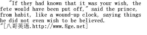 若是人家知道您有这种心愿,庆祝会就得取消的。"公爵说道,他俨然像一架上紧发条的钟,习惯地说些他不想要别人相信的话。"Nemetourmentezpas.Ehbienqu'a-t-ondecideparrapportaladepechedeNovosilzoff?Voussaveztout."② ②法语: 请您不要折磨我。哦,他们就诺沃西利采夫的紧急情报作出了什么决议?这一切您了若指掌。 "Don't tease me. Well, what has been decided in regard to the Novosiltsov dispatch? You know everything." " 怎么对您说好呢?"公爵说道,他的语调冷淡,索然无味。"Qu'a-t-ondecide?OnadecidequeBuonaparteabrulesesvaisseaux,etjecroisquenoussommesentraindebrulerlesnotres."③ ③法语: 决定了什么?他们决定: 波拿巴既已焚烧自己的战船,看来我们也要准备这样做。 "What is there to tell?" said the prince in a tired, listless tone. "What has been decided? It has been decided that Bonaparte has burnt his ships, and I think that we are about to burn ours." 瓦西里公爵向来是慢吞吞地说话,像演员口中道出旧台词那样。安娜·帕夫洛夫娜·舍列尔虽说是年满四十,却反而充满活力和激情。