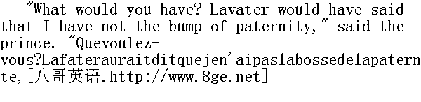①"公爵说道。 ①法语: 怎么办呢?拉法特会说我没有父爱的骨相。 "Don't keep on joking. I wanted to talk to you seriously. Do you know I'm not pleased with your youngest son. Between ourselves" (her face took its mournful expression), "people have been talking about him to her majesty and commiserating you..."" 请不要再开玩笑。我想和您认真地谈谈。您知道,我不满意您的小儿子。对这些话请别介意,就在我们之间说说吧(她脸上带有忧悒的表情),大家在太后跟前议论他,都对您表示惋惜......" The prince did not answer, but looking at him significantly, she waited in silence for his answer. Prince Vassily frowned. 公爵不回答,但她沉默地、有所暗示地望着他,等待他回答。瓦西里公爵皱了一阵眉头。 "What would you have me do?" he said at last. "You know I have done everything for their education a father could do, and they have both turned out des imbeciles. Ippolit is at least a quiet fool, while Anatole's a fool that won't keep quiet, that's the only difference," he said, with a smile, more unnatural and more animated than usual, bringing out with peculiar prominence something surprisingly brutal and unpleasant in the lines about his mouth. " 我该怎样办呢?"他终于说道。"您知道,为教育他们,我已竭尽为父的应尽的能事,可是到头来两个都成了desimBbeciles,②伊波利特充其量是个温顺的笨蛋,阿纳托利却是个惴惴不安的笨蛋。这就是二人之间唯一的差异。"他说道,笑得比平常更不自然,更兴奋,同时嘴角边起了皱褶,特别强烈地显得出人意料地粗暴和可憎。 "Why are children born to men like you? If you weren't a father, I could find no fault with you," said Anna Pavlovna, raising her eyes pensively. " 为什么像您这种人要生儿女呢?如果您不当父亲,我就无话可责备您了。"安娜·帕夫洛夫娜说道,若有所思地抬起眼睛。 "I am your faithful slave and to you alone I can confess. My children are the bane of my existence. It's the cross I have to bear, that's how I explain it to myself. What would you have?" ... He broke off with a gesture expressing his resignation to a cruel fate. Anna Pavlovna pondered a moment. "Jesuisvotre ①忠实的奴隶,etavousseulejepuisl'avou-er,我的孩子们--cesontlesentravesdemonexisBtence,②这就是我的苦难。我是这样自我解释的。Quevoulezvous?......"③他默不作声,用手势表示他听从残酷命运的摆布。安娜·帕夫洛夫娜陷入了沉思。 ①法语: 我是您的。 ②法语: 我只能向您一人坦白承认。我的孩子们是我的生活负担。 "Have you never thought of marrying your prodigal son Anatole? People say," she said, "that old maids have a mania for matchmaking. I have never been conscious of this failing before, but I have a little person in my mind, who is very unhappy with her father, a relation of ours, the young Princess Bolkonsky."Prince Vassily made no reply, but with the rapidity of reflection and memory characteristic of worldly people, he signified by a motion of the head that he had taken in and was considering what she said. " 您从来没有想到替您那个浪子阿纳托利娶亲的事么?据说,"她开口说道,"老处女都有lamainedesmariages,①我还不觉得我自己会有这个弱点,可是我这里有一个petitepersonne,②她和她父亲相处,极为不幸,她就是博尔孔斯卡娅,uneparenteanous,uneprincesse."③尽管瓦西里公爵具备上流社会人士固有的神速的颖悟力和记忆力,但对她的见识他只是摇摇脑袋表示要加以斟酌,并没有作答。 "No, do you know that that boy is costing me forty thousand roubles a year?" he said, evidently unable to restrain the gloomy current of his thoughts. He paused. "What will it be in five years if this goes on? These are the advantages of being a father.... Is she rich, your young princess?" " 不,您是不是知道,这个阿纳托利每年都要花费我四万卢布。"他说道,看来无法遏制他那忧悒的心绪。他沉默了片刻。"若是这样拖下去,五年后那会怎样呢?VoilaL'avantagea'etrepere。④您那个公爵小姐很富有吗?" ①法语: 为人办婚事的癖性。 ②法语: 少女。 ⑤法语: 这就是为父的益处。 "Her father is very rich and miserly. He lives in the country. You know that notorious Prince Bolkonsky, retired under the late emperor, and nicknamed the 'Prussian King.' He's a very clever man, but eccentric and tedious. The poor little thing is as unhappy as possible. Her brother it is who has lately been married to Liza Meinen, an adjutant of Kutuzov's. He'll be here this evening." " 他父亲很富有,可也很吝啬。他在乡下居住。您知道,这个大名鼎鼎的博尔孔斯基公爵早在已故的皇帝在位时就退休了,他的绰号是'普鲁士国王'。他是个非常聪明的人,可脾气古怪,难于同他相处。Lapauvrepetiteestmalheureuse,commelespierres,①她有个大哥,在当库图佐夫的副官,就在不久前娶上了丽莎·梅南,今天他要上我这儿来。" "Listen, dear Annette," said the prince, suddenly taking his companion's hand, and for some reason bending it downwards. "Arrange this matter for me and I am your faithful slave for ever and ever. She's of good family and well off. That's all I want." "Ecoutez,chereAnnette, ②"公爵说道,他忽然抓住交谈者的手,不知怎的使它稍微向下弯。"Arrangez-moicetteaffaireetjesuisvotre③最忠诚的奴隶atoutjamais(奴辈,commemon村长m'ecritdes④在汇报中所写的)。她出身于名门望族,又很富有。这一切都是我所需要的。" And with the freedom, familiarity, and grace that distinguished him, he took the maid-of-honour's hand, kissed it, and as he kissed it waved her hand, while he stretched forward in his low chair and gazed away into the distance. 他的动作灵活、亲昵而优美,可作为他的表征,他抓