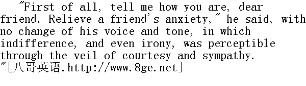 亲爱的朋友,请您首先告诉我,身体可好吗?您让我安静下来,"他说道,嗓音并没有改变,透过他那讲究礼貌的、关怀备至的腔调可以看出冷淡的、甚至是讥讽的意味。 "How can one be well when one is in moral suffering? How can one help being worried in these times, if one has any feeling?" said Anna Pavlovna. "You'll spend the whole evening with me, I hope?" " 当你精神上遭受折磨时,身体上怎么能够健康呢?......在我们这个时代,即令有感情,又怎么能够保持宁静呢?"安娜·帕夫洛夫娜说道,"我希望您整个晚上都待在我这儿,好吗?" "And the fete at the English ambassador's? To-day is Wednesday. I must put in an appearance there," said the prince. "My daughter is coming to fetch me and take me there." " 英国公使的喜庆日子呢?今日是星期三,我要在那里露面,"公爵说道,"我女儿顺便来接我,坐一趟车子。" "I thought to-day's fete had been put off. I confess that all these festivities and fireworks are beginning to pall." " 我以为今天的庆祝会取消了。Jevousavouequetoutescesfetesettouscesfeuxd'artificecommencentadevenirinBsipides."① ①法语: 老实说,所有这些庆祝会、烟火,都令人厌恶极了。