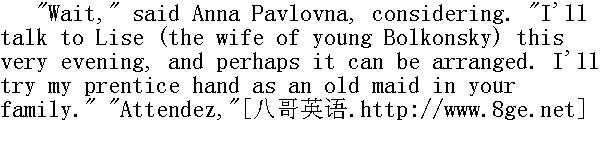 ⑤安娜·帕夫洛夫娜思忖着说道,"我今天跟丽莎(Lafemmedujeune博尔孔斯基⑥)谈谈,也许这事情会办妥的。Ceseradansvotrefamille,quejeferaimonapBprentissagedevieillefille.⑦" ①法语: 这个可怜的小姐太不幸了。 ②法语: 亲爱的安内特,请听我说吧。 ③法语: 替我办妥这件事,我就永远是您的。 ④法语: 正如我的村长所写的。 ⑥法语: 博尔孔斯基的妻子。 ⑥我开始在您家里学习老处女的行当。