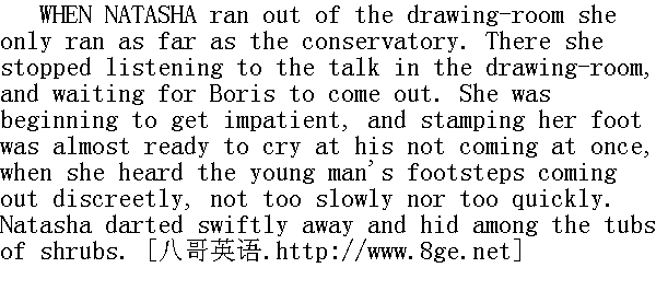您愿意吻吻我吗?"她低声细语, 几乎听不清楚, 皱着眉头向他瞧着, 脸上露出微笑, 激动得几乎要哭出声来。 Boris reddened. "How absurd you are!" he said, bending down to her, flushing redder still, but doing nothing, waiting what would come next. Suddenly she jumped on to a tub, so that as she stood she was taller than he, flung both arms round him so that her slender, bare arms clasped him above his neck, and flinging back her hair with a toss of her head, she kissed him just on his lips. 鲍里斯面红耳赤。"您多么可笑!"他说道, 向她弯下腰来, 面红得更加厉害, 但却没有采取任何行动, 只是等待好机会。她突然跳到花桶上, 身段就显得比他高了, 她用自己的双手把他抱住了, 于是她那纤细的裸露的手臂在他的颈项上方弯成弧形了, 她仰起头来, 把头发甩在后面, 正好在他的唇上吻了一下。 She slipped away among the flower-pots on the other side, and stood with hanging head. 她经过花钵中间窜到花丛的另一边, 低垂着头, 停步不前了。 "Natasha," he said, "you know I love you, but-"" 娜塔莎, "他说道, "您知道我是爱您的, 可是......" "You're in love with me," Natasha broke in. " 您爱上我了吗?"娜塔莎打断了他的话。