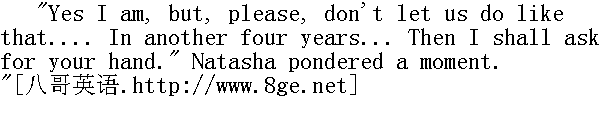 是的, 我爱上您了, 但是您瞧, 真是的, 我们以后不要像刚才那样冒冒失失......还有四个年头......那时候我会向您求婚。"娜塔莎思忖了一下。 "Thirteen, fourteen, fifteen, sixteen ..." she said, counting on her thin little fingers."Very well. Then it's settled?" And her excited face beamed with a smile of delight and relief. " 十三岁, 十四岁, 十五岁, 十六岁......"她说道, 弯屈着她那纤细的指头算算, "很好!那么成了定局罗?"欣喜和安定的微笑使她兴奋的面部神采奕奕。 "Settled!" said Boris. " 成定局了!"鲍里斯说道。 "For ever?" said the little girl. "Till death?" And taking his arm, with a happy face she walked quietly beside him into the next room. " 永远吗?"小女孩说道, "一直到寿终正寝?"她于是挽着他的手臂, 露出幸运的神色, 静悄悄地和他并排走到摆满沙发的休息室里去。