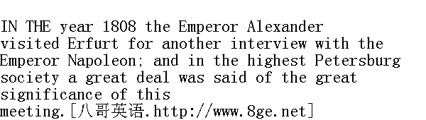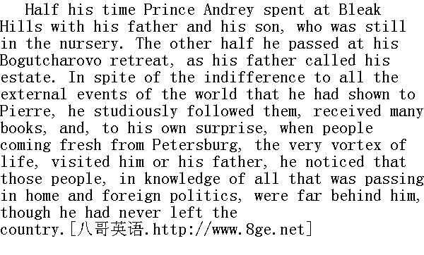 一八○八年, 亚历山大皇帝去埃尔富特城和拿破仑皇帝再次会晤, 因此彼得堡上流社会中谈论许多关于这次隆重会晤的伟大意义。 In 1809 the amity between the two sovereigns of the world, as Napoleon and Alexander used to be called, had become so close that when Napoleon declared war that year with Austria, a Russian corps crossed the frontier to co-operate with their old enemy Bonaparte against their old ally, the Austrian Emperor; so close that in the highest society there was talk of a possible marriage between Napoleon and one of the sisters of the Emperor Alexander. But, apart from foreign policy, the attention of Russian society was at that time drawn with special interest to the internal changes taking place in all departments of the government. 一八○九年, 拿破仑和亚历山大宣称, 世界的两位主宰的密切联系已经达到那种程度, 致使拿破仑于是年对奥宣战时, 俄国军团竟前往境外协助从前的敌人波拿巴以反对从前的盟友奥地利皇帝, 而且上流社会正在谈论拿破仑和亚历山大皇帝的一个妹妹可能成婚的事。但是除开对外政策而外, 当时俄国社会特别深切地关注这个时期国家行政管理的各个部门中所实施的内部改革。 Life meanwhile, the actual life of men with their real interests of health and sickness, labour and rest, with their interests of thought, science, poetry, music, love, affection, hatred, passion, went its way, as always, independently, apart from the political amity or enmity of Napoleon Bonaparte, and apart from all possible reforms. 与此同时, 生活, 人们的真正生活, 他们对健康、疾病、劳动、休息这些实际利益的关注, 他们对思想、科学、诗歌、音乐、爱情、友谊、仇恨、激情的关注, --一切与平日无异, 不以政治上与拿破仑·波拿巴亲近或敌对为转移, 也不以各种可能实行的改革为转移。 Prince Andrey had spent two years without a break in the country. All those projects which Pierre had attempted on his estates, and changing continually from one enterprise to another, had never carried out to any real result-all those projects had been carried out by Prince Andrey without display to any one and without any perceptible exertion. He possessed in the highest degree the quality Pierre lacked, that practical tenacity which, without fuss or any great effort on his part, set things in working order. 安德烈公爵从不外出, 在农村定居已两年。皮埃尔意欲做的那些经营领地的事业, 因为不断地转换工种, 没有取得任何成果, 而安德烈公爵不向任何人声张, 也没有花费多大的劳力, 就完成了这全部事业。他在颇大程度上赋有皮埃尔所缺乏的百折不回的实干能力, 凭藉这种能力可以不吃力地促使事业进展。 On one estate of his, three hundred serfs were transformed into free cultivators (it was one of the first examples in Russia), in others forced labour was replaced by payment of rent. On Bogutcharovo a trained midwife had been engaged at his expense to assist the peasant-women in childbirth, and a priest, at a fixed salary, was teaching the children of the peasants and house servants to read and write. 他的一个拥有三百农奴的领地被改革了, 农奴都变成自由庄稼人(这是俄国最初的范例之一), 在其他领地, 代役租制已取代徭役租制。在博古恰罗沃, 他出钱函请一位有文化的接生婆, 替产妇助产, 神甫也领取薪水, 教农民子女和仆人子女识字。