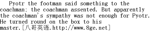 仆役彼得对马车夫说了一句什么话, 马车夫作了肯定的回答。看来彼得心里觉得马车夫光表示赞同还是不够的, 他在马车夫的坐位上向老爷转过身来。 "Your excellency, how soft it is!" he said, smiling respectfully." 大人, 这多么畅快!"他恭敬地面露笑容说。 "Eh?"" 什么!" "It is soft, your excellency."" 大人, 这多么畅快。" "What does he mean?" wondered Prince Andrey. "Oh, the weather, most likely," he thought, looking from side to side. "And, indeed, everything's green already...how soon! And the birch and the wild cherry and the alder beginning to come out....But I haven't noticed the oak. Yes, here he is, the oak!"" 他在说什么?"安德烈公爵想了想。"对, 他想必是说春天, "他环顾四周, 想道, "而且什么都放青了......多么快啊!无论是桦树、稠李、还是赤杨都已经开始......可是没有看见橡树, 瞧, 这就是橡树。"