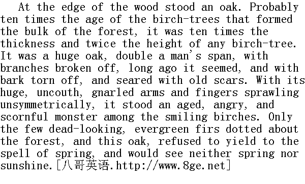 路边有一株橡树。它大概比那长成树林的桦树老九倍, 粗九倍, 比每株桦树高一倍。这是一棵两抱粗的大橡树, 有许多树枝看来早就折断了, 裂开的树皮满布着旧的伤痕。它那弯曲多节的笨拙的巨臂和手指不对称地伸开, 它这棵老气横秋的、鄙夷一切的畸形的橡树耸立在笑容可掬的桦树之间。唯独它不欲屈从于春日的魅力, 不欲目睹春季, 亦不欲目睹旭日。 "Spring and love and happiness!" that oak seemed to say. "Are you not sick of that ever-same, stupid, and meaningless cheat? Always the same, and always a cheat! There is no spring, nor sunshine, nor happiness. See yonder stand the cramped, dead fir-trees, ever the same, and here I have flung my torn and broken fingers wherever they have grown out of my back or my sides. As they have grown, so I stand, and I put no faith in your hopes and deceptions."" 春季、爱情和幸福呀!"这棵橡树好像在说话, "总是一样愚蠢的毫无意义的欺骗, 怎能不使您们觉得厌恶啊!总是老样子, 总是骗局!既没有春季, 也没有旭日, 也没有幸福啊!你们看, 那些永远是孤单的被压死的枞树还栖在那里, 我也在那里伸开我那被折断的、被剥皮肤的手指, 无论手指从哪里--从背脊或从肋部--长出来, 不管怎样长出来, 我还是那个样子, 我不相信你们的冀望和欺骗。" Prince Andrey looked round several times at that oak as though he expected something from it. There were flowers and grass under the oak too, but still it stood, scowling, rigid, weird and grim, among them. 安德烈公爵在经过森林时, 接连有几次回过头来看这棵橡树, 好像对它有所期待似的。橡树底下也长着花朵和野草, 但是它仍然皱着眉头, 一动不动地, 像个畸形儿屹立在它们中间。 "Yes, he's right, a thousand times right, the old oak," thought Prince Andrey. "Others, young creatures, may be caught anew by that deception, but we know life-our life is over!" A whole fresh train of ideas, hopeless, but mournfully sweet, stirred up in Prince Andrey's soul in connection with that oak. During this journey he thought over his whole life as it were anew, and came to the same hopeless but calming conclusion, that it was not for him to begin anything fresh, that he must live his life, content to do no harm, dreading nothing and desiring nothing. " 是啊, 它是正确的, 这颗橡树千倍地正确, "安德烈公爵想道。"让其他的年轻人又去受骗吧, 不过我们是知道人生的, --我们的一生已经完结了!"由于这棵老橡树的关系, 又有一序列绝望的、但都是忧喜掺半的思想在安德烈公爵的心灵中出现了。在这次旅行中, 他仿佛又考虑到自己的一生, 并得出从前那种于心无愧的、无所指望的结论, 他无须从头做起, 既不为非作歹, 也不自我惊扰, 不怀抱任何欲望, 应该好好地度过一辈子。