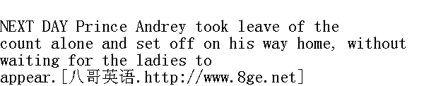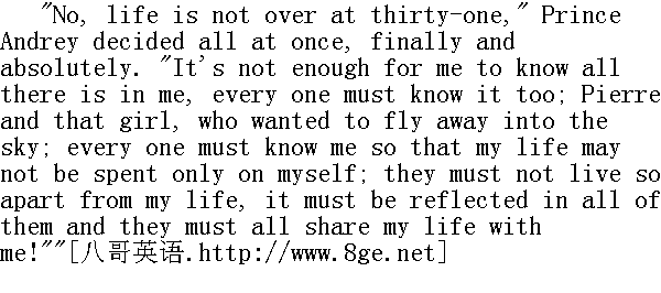 不, 人在三十一岁时生命没有终结, "安德烈公爵忽然坚决地斩钉截铁地断送说, "我只是知道我心中的一切还是不够的, 而且要大家--无论是皮埃尔;还是这个想飞上天空的少女--都知道这一点, 要让大家知道我, 我不是为了我一个人而生活, 不让他们的生活和我的生活毫无关联, 要让我的生活对大家产生影响, 他们大家和我一同生活!" On getting home after his journey, Prince Andrey made up his mind to go to Petersburg in the autumn, and began inventing all sorts of reasons for this decision. A whole chain of sensible, logical reasons, making it essential for him to visit Petersburg, and even to re-enter the service, was at every moment ready at his disposal. He could not indeed comprehend now how he could ever have doubted of the necessity of taking an active share in life, just as a month before he could not have understood how the idea of leaving the country could ever occur to him. It seemed clear to him that all his experience of life would be wasted and come to naught, if he did not apply it in practice and take an active part in life again. He could not understand indeed how on a basis of such poor arguments it could have seemed so incontestable to him that he would be lowering himself, if after the lessons he had received from life, he were to put faith again in the possibility of being useful and in the possibility of happiness and of love. Reason now gave its whole support to the other side. After his journey to Ryazan, Prince Andrey began to weary of life in the country; his former pursuits ceased to interest him, and often sitting alone in his study, he got up, went to the looking-glass and gazed a long while at his own face. Then he turned away to the portrait of Liza, who, with her curls tied up a la grecque, looked gaily and tenderly out of the gold frame at him. She did not say those terrible words to him; she looked curiously and merrily at him. And, clasping his hands behind him, Prince Andrey would walk a long while up and down his room, frowning and smiling by turns, as he brooded over those irrational ideas, that could not be put into words, and were secret as a crime-the ideas connected with Pierre, with glory, with the girl at the window, with the oak, with woman's beauty, and love, which had changed the whole current of his life. And if any one came into his room at such moments, he would be particularly short, severely decided and disagreeably logical. 安德烈公爵在旅行归来以后, 拿定主意, 要在秋天到彼得堡去, 并且想到作出这个决定的各种原因。他时时刻刻都能琢磨出一系列合情合理的论据--他为什么要到彼得堡去, 甚至在那里服役。他甚至在目前还不明白, 他对他要积极参与生活一事怎么会犹豫不决, 恰如一个月以前他不明白怎么会想到离开村庄一样。他明显地觉得, 如果他不把他在生活上积累的全部经验应用于事业上, 不再积极参与生活, 那末他的全部经验必定是毫无稗益的, 毫无意义的。他甚至不明白, 从前根据这样一些乏于情理的论据怎么能够明显地看出: 如果在受到生活教训之后, 又深信自己能够给事业带来利益, 深信自己能够获得幸福和爱情, 这样, 就会有失身份了。而今理智提示了截然不同的内容。在这次旅行之后, 安德烈公爵开始觉得在乡下寂寞, 他对以前的业务不感兴趣, 常常一个人坐在书斋里, 常常站起来, 走到镜台前, 久久地注视自己的面孔。然后他转过头来, 注视着亡妻丽莎的画像, 他留着一头蓬松的a la grecque①卷发, 温存地快活地从金色的框子里望着他。她已经不向丈夫说些从前那样可怕的话, 她带着好奇的神态朴直地快活地望着他。安德烈公爵背着手在房里走来走去, 走了很久, 时而皱起眉头, 时而微露笑容, 他反复琢磨那些不合时宜的、非言语所能形容的、像罪行一样隐秘的思想, 这些思想牵连到皮埃尔、荣誉、呆在窗口的女郎、橡树、妇人的美貌和爱情, 这些思想改变了他的整个生活。在这种时刻, 有人进门来走到他跟前, 他往往分外冷漠, 严肃而果断尤其是讲些令人听来不悦意的大道理。 ①法语: 希腊式。 "Mon cher," Princess Marya would say coming in at such a moment, "Nikolushka cannot go out for a walk to-day; it is very cold." "Mon cher, "①公爵小姐玛丽亚常在这时候走进来, 她说: "尼古卢什卡今儿不能去散步: 天气很冷。" "If it were hot," Prince Andrey would answer his sister with peculiar dryness on such occasions, "then he would go out with only his smock on; but as it is cold, you must put on him warm clothes that have been designed for that object. That's what follows from its being cold, and not staying at home when the child needs fresh air," he would say, with an exaggerated logicality, as it were punishing some one for that secret, illogical element working within him.On such occasions Princess Marya thought what a chilling effect so much intellectual work had upon men." 如果天气暖和, "这时安德烈特别冷漠地回答妹妹说, "他只要穿件衬衫就行了, 因为天气很冷, 就应当给他穿件暖和的衣裳, 就是为了这个缘故才有人想到给他做件暖和的衣裳。因为天气很冷, 所以才要这样做, 而不是说, 当孩子需要新鲜空气的时候硬要他留在家里。"他说得特别合乎情理, 就仿佛为了他内心产生这种隐秘的不合乎情理的智力活动而处罚某人似的。在这种情况下公爵小姐玛丽亚往往想到智力活动会使男人们面容憔悴, 使他们变得冷漠无情。