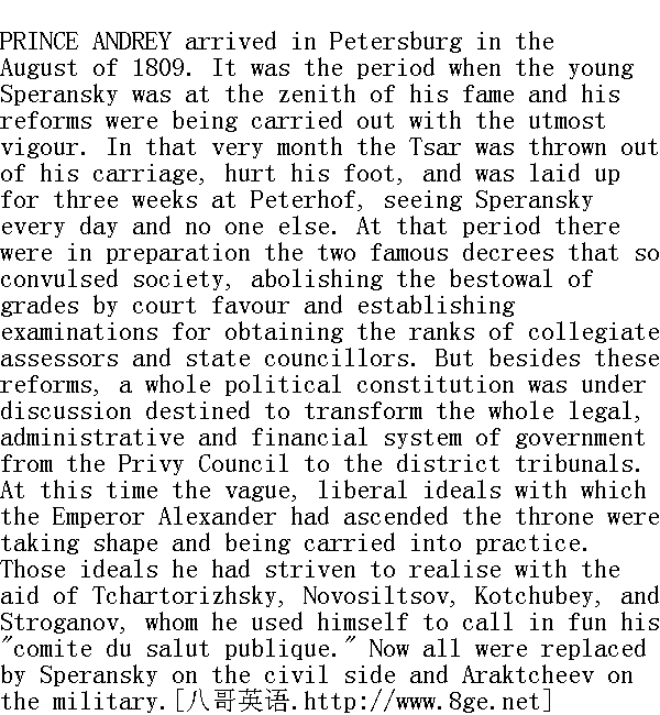 一八○九年八月, 安德烈公爵已抵达彼得堡。时值年轻的斯佩兰斯基①的声誉已臻达顶峰, 他正如火如荼地实行社会变革。就在八月份, 国王乘坐四轮马车时翻车, 跌伤一条腿, 他在彼得霍夫市停留三周, 这期间国王每天只与斯佩兰斯基一人会面。这时候不仅正在准备拟订两道如此著名而且惊动社会的命令--取消宫廷官衔、八等文官和五等文官举行考试的命令, 除此之外, 还准备拟订一整套国家宪法, 这部宪法中规定, 自乡政府直至国务院必须改变现有的俄国司法、行政和财政制度。亚历山大皇帝即位时怀抱的不明确的自由主义理想刻正付诸实现, 他渴望凭藉如下的助手以实现这些理想: 恰托里日斯基、诺沃西利采夫、科丘别伊和斯特罗加诺夫, 他将这些人诙谐地称为comitedu salut pulique②。 ①斯佩兰斯基(1772~1839), 俄国改良派政治活动家, 欲使俄国农奴制度迎合资本主义发展的需要, 在封建贵族高压之下, 他无法施展个人的才略, 备受奚落, 遂于一八一二年被逐。 ②法语: 社会救济委员会。 Soon after his arrival, Prince Andrey, as a kammerherr, presented himself at court and at a levee. The Tsar, meeting him on two occasions, did not deign to bestow a single word upon him. Prince Andrey had fancied even before then that he was antipathetic to the Tsar; that the Tsar disliked his face and his whole personality. In the cold, repellent glance with which the Tsar looked at him, Prince Andrey found further confirmation of this supposition. Courtiers explained the Tsar's slight to Prince Andrey by saying that his majesty was displeased at Bolkonsky's having retired from active service since 1805. 目前在民政部门由斯佩兰斯基、在军政部门由阿拉克切耶夫取代所有这些人。安德烈公爵抵达后不久, 担任宫廷高级侍从, 进入宫廷, 参加朝觐时的活动。国王遇见他, 有两次没有对他说一句话。安德烈公爵一向就仿佛觉得, 国王憎恶他, 他的面孔和他整个身心都令国王望而生厌。国王用那冷淡而疏远的目光望望他, 安德烈公爵凭他这种目光就比以前更加肯定地证实了这种推测。廷臣们向安德烈公爵解释说, 国王不重视他是因为陛下对他--博尔孔斯基从一八○五年以来未曾服役表示不满。 "I know myself that one has no control over one's likes and dislikes," thought Prince Andrey, "and so it is of no use to think of presenting my note on army reform in person to the Tsar, but the thing will speak for itself." He sent word about his note to an old field-marshal, a friend of his father's. The field-marshal fixed an hour to see him, received him cordially, and promised to lay it before the Tsar. A few days later, Prince Andrey received notice that he was to call upon the minister of war, Count Araktcheev." 我本人知道, 人人都会对别人产生好感, 或者产生反感, 不过我们无可奈何, "安德烈公爵想道, "因此用不着想到关于亲自向国王送交军事条令呈文的事情, 但事情本身是会说明问题的。"他把有关他的呈文的内容转告父亲的友人--老元帅。元帅约定了一个时间, 亲切地接见他, 并且答应把这件事禀告国王。过了几天有人告知安德烈公爵: 他应当去见军政大臣阿拉克切耶夫伯爵。