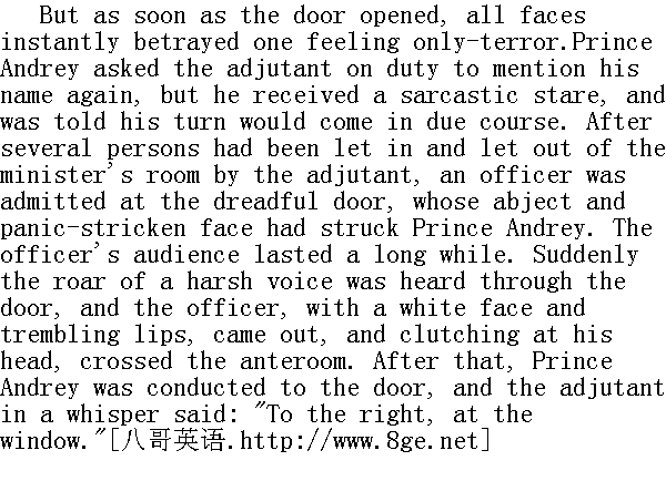 但是一当房门打开了, 大伙儿的脸上顿时流露出一种表情--恐惧。安德烈公爵请求值班人员下次替他禀报, 但是大伙儿带着嘲笑的神态瞥了他一眼, 并对他说, 到适当的时候就轮到他了。当副官把这几个人从大臣办公室领进来又把他们领出去以后, 有人让一个军官走进一扇可怕的房门里来, 军官那低首下心的惊惶的样子使安德烈公爵大为愕异。这个军官的接见延续了很长的时间。忽然从门后传来令人生厌的时断时续的说话声, 这个军官脸色苍白, 双唇颤抖着, 从那里走了出来, 抱住头从接待室走过去了。紧接着, 安德烈公爵被领到门口, 值班人员轻声地说: "右边, 向那个窗口走去吧。" Prince Andrey went into a plain, neat study, and saw at the table a man of forty with a long waist, with a long, closely-cropped head, deep wrinkles, scowling brows over brown-green, dull eyes, and a red, over-hanging nose. Araktcheev turned his head towards him, without looking at him. 安德烈公爵走进一间陈设简单而整洁的办公室, 他在桌旁看见一个四十岁的人, 长长的腰身, 长长的脑袋, 头发剪得短短的, 脸上的皱纹很深, 紧皱的双眉下面露出绿褐色的眼睛, 红红的鼻子半悬垂着。阿拉克切耶夫向他转过头来, 眼睛却没有看着他。 "What is it you are petitioning for?" asked Araktcheev." 您有何请求?"阿拉克切耶夫问道。 "There is nothing that I am...petitioning for, your excellency," Prince Andrey pronounced softly. Araktcheev's eyes turned to him." 大人, 我什么都不......请求。"安德烈公爵低声地说。阿拉克切耶夫向他转过脸来。 "Sit down," said Araktcheev. "Prince Bolkonsky?"" 请坐, "阿拉克切耶夫说, "博尔孔斯基公爵。"