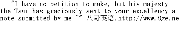 我什么也不请求, 皇帝陛下叫我把递上的呈文转送给大人......" "Be so good as to see, my dear sir; I have read your note," Araktcheev interrupted, uttering only the first words civilly, again looking away from him, and relapsing more and more into a tone of grumbling contempt. "Is it new army regulations you propose? There are regulations in plenty; no one will carry out the old ones. Nowadays every one's drawing up regulations; it's easier writing than doing."" 我亲爱的, 请注意, 我看过您的禀奏了, "阿拉克切耶夫打断他的话, 只是头几句话倒说得亲切, 他这次又不看他的面孔了, 腔调儿显得越来越不满而且轻蔑, "您提出新的军事条令吗?法令多得很, 无人可来执行旧法令。目前都在写法令, 写比做更为容易。" "I have come by the desire of his majesty the Tsar to learn from your excellency how you propose to deal with my project," said Prince Andrey courteously." 我遵照陛下的旨意前来向大人打听, 您打算怎样处理递上的呈文?"安德烈公爵毕恭毕敬地说。 "I have proposed a resolution in regard to your note, and have forwarded it to the committee. I do not approve," said Araktcheev, getting up and taking a paper out of the writing-table. "Here." He gave it to Prince Andrey. Right across the note had been scrawled, without punctuation or capital letters and with words misspelt: "Superficially compiled seeing that it's drawn up in imitation of the French army regulations and needlessly departing from the standing orders."" 我对您的禀奏作出了批示并转送委员会。我不赞成, "阿拉克切耶夫站立起来, 从写字台上拿起一份公文时说道, "瞧。"他把公文递给安德烈公爵。公文纸上用铅笔横着写了一行字, 没有大写字母, 没有拼写错误, 也没有标点符号: "毫无理由抄袭法国军事条令, 毋需放弃军法条例。" "To what committee has the note been referred?" asked Prince Andrey." 呈文究竟转交给什么委员会?"安德烈公爵问道。