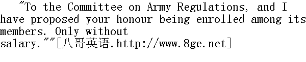 转交给军事条令委员会, 我推荐阁下担任委员。只是没有薪金。" Prince Andrey smiled. 安德烈公爵微微一笑。 "I am not seeking a salary."" 我没有这种愿望。" "A member without salary," repeated Araktcheev. "I wish you good day. Hey! call! who's the next?" he shouted, as he bowed to Prince Andrey." 没有薪金当委员, "阿拉克切耶夫重复地说。"我与阁下结识, 深感荣幸。喂!请把名字说声来!还有什么人?"他向安德烈公爵鞠躬行礼时大声喊道。