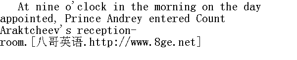 在约定的那天, 上午九点钟, 安德烈公爵来到接待室求见阿拉克切耶夫伯爵。 Prince Andrey did not know Araktcheev personally and had never seen him, but all that he knew about him had inspired him with little respect for the man. 安德烈公爵本人不认识阿拉克切耶夫, 从来没有见过他, 但是他知道的有关他的一切情形, 不太会引起他对这个人的尊敬。 "He is the minister of war, a person the Tsar trusts, and no one need have any concern with his personal qualities; he has been commissioned to look at my note, consequently he is the only person who can get it adopted," thought Prince Andrey, as he waited among many persons of importance and unimportance in Count Araktcheev's anteroom." 他是军政大臣, 皇帝陛下的代理人, 谁也不应该去管他个人的品质, 他接受委托来审理我的呈文, 因此只有他一人才能把它送去办理。"安德烈公爵想道, 在接待室介乎许多显要的、非显要的官员之间等候阿拉克切耶夫伯爵。 During the years of his service-for the most part as an adjutant-Prince Andrey had seen the anterooms of many great personages, and the various characteristic types of such anterooms were very readily recognised by him. Count Araktcheev's anteroom had quite a special character. The faces of the persons of no consequence who were awaiting their turns for an audience with Count Araktcheev betrayed a feeling of humiliation and servility; the faces of those of superior rank all wore an expression of general discomfort, concealed under a mask of ease and ridicule, of themselves and their position and the person they were waiting to see. Some of them walked up and down plunged in thought; others were laughing and whispering together, and Prince Andrey caught the nickname Sila Andreitch (Sila meaning Force or Violence), and the words "the governor'll give it you," referring to Count Araktcheev. One general (a person of great consequence), unmistakably chagrined at being kept waiting so long, sat with crossed legs, disdainfully smiling to himself. 安德烈公爵在他担任职务、多半是担任副官职务期间, 看见过许多显要官员的接待室, 因此这些接待室的各种不同的特征, 他一清二楚, 了若指掌。阿拉克切耶夫伯爵的接待室是十分特殊的。在阿拉克切耶夫伯爵接待室里, 在依次等待接见的非显要官员的脸上, 可以看到一种羞愧和恭顺的表情, 在较为显要的官员的脸上, 可以普遍地看出困窘不安的表情, 官员的假像遮盖了不安的表情, 他们假装出毫无拘束的样子, 假装出嘲笑自己, 嘲笑自己的地位, 也嘲笑他们所等待的官员。有的人若有所思地踱来踱去, 有的人窃窃私语, 嘻皮笑脸, 安德烈公爵听见那针对阿拉克切耶夫伯爵喊出的"西拉(意指权势)·安德烈伊奇"这个绰号(sobriquet①)和针对他说的"大叔给你点厉害瞧"这句话。有一个将军(显要人物)很明显是因为等候得太久而感到十分委屈, 他坐在那里, 交替地架起二郎腿, 暗自轻蔑地微笑。 ①法语: 绰号。