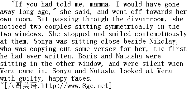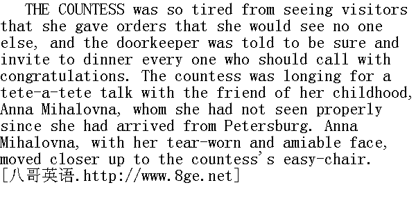 会客的事情使伯爵夫人疲惫不堪, 她吩咐不再招待任何人, 又指示门房, 只邀请一些务须登门饮宴的贺客。伯爵夫人想和自己童年时代的女友--名叫安娜?米哈伊洛夫娜的公爵夫人单独晤谈, 自从她自彼得堡归来, 伯爵夫人还没有好好地探查她啦。安娜?米哈伊洛夫娜露出一幅泪痕斑斑但却令人心欢的面孔, 把身子移向伯爵夫人的安乐椅近旁。 "With you I will be perfectly open," said Anna Mihalovna. "We haven't many old friends left. That's how it is I value your friendship so." " 我对你直言不讳, "安娜?米哈伊洛夫娜说道, "我们这些老朋友剩存的已经很少了!因此, 我十分珍惜你的友情。" Anna Mihalovna looked at Vera and stopped. The countess pressed her friend's hand. 安娜?米哈伊洛夫娜望了望薇拉, 便停住了。伯爵夫人握了握朋友的手。 "Vera," said the countess to her eldest daughter, unmistakably not her favourite, "how is it you have no notion about anything? Don't you feel that you're not wanted here? Go to your sister or ..."" 薇拉, "伯爵夫人把脸转向显然不受宠爱的长女, 说道, "您怎么一点不明事理啊?难道你不觉得, 你在这里是个多余的人吗?到几个妹妹那里去吧, 或者......" The handsome young countess smiled scornfully, apparently not in the least mortified. 貌美的薇拉鄙夷地微露笑容, 显然她一点也不感到屈辱。