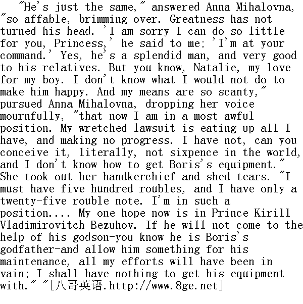 伯爵夫人两眼噙着泪水, 沉默地想着什么事。 "I often think-perhaps it's a sinful thought," said the princess-"but I often think: here is Prince Kirill Vladimirovitch Bezuhov living all alone ... that immense fortune ... and what is he living for? Life is a burden to him, while Boris is only just beginning life." " 我常常想到, 这也许就是罪孽, "那公爵夫人说道, "我常常想到, 基里尔?弗拉基米罗维奇?别祖霍夫伯爵孤单地生活......他有这么多产业......他的生活目的何在?对他来说, 生命是沉重的负担, 可是鲍里斯才刚刚开始生活。" "He will be sure to leave something to Boris," said the countess. " 他想必会给鲍里斯留下什么财产。"伯爵夫人说道。 "God knows, chere amie! These wealthy grand people are such egoists. But still I'm going to see him at once with Boris, and I will tell him plainly the state of the case. People may think what they choose of me, I really don't care, when my son's fate depends on it." The princess got up. "It's now two o'clock, and you dine at four. I shall have time to drive there and back." "chereamie ①, 天晓得!这些富翁和显贵都是利己主义者。但是我还是即刻偕同鲍里斯到他那里去, 坦率地对他说明, 究竟是怎么一回事。人家对我抱有什么看法, 请听便吧, 说实话, 只要儿子的命运有赖于此事, 我一切都不在乎, "公爵夫人站立起来, "现在是两点钟, 四点钟你们吃午餐。我出去走走还来得及哩。" ①法语: 亲爱的朋友。