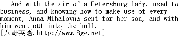安娜?米哈伊洛夫娜具有精明能干、善于利用时间的彼得堡贵族夫人的作风, 她派人去把儿子喊来, 和他一同到接待室去。 "Good-bye, my dear," she said to the countess, who accompanied her to the door. "Wish me good-luck," she added in a whisper unheard by her son. " 我的心肝, 再会吧, "她对送她到门口的伯爵夫人说道, "请你祝我成功吧。"她背着儿子轻言细语地补充说一句。 "You're going to Prince Kirill Vladimirovich's, ma chere?" said the count, coming out of the dining-room into the hall. "If he's better, invite Pierre to dine with us. He has been here; used to dance with the children. Be sure you invite him, ma chere. Now do come and look how Taras has surpassed himself to-day. He says Count Orlov never had such a dinner as we're going to have to-day." "machere, 您到基里尔?弗拉基米罗维奇伯爵那里去吗?"伯爵从餐厅出来, 也到接待室去时, 说道, "如果皮埃尔身体好一些, 请他上我家里来吃午饭。要知道, 他时常到我这里来, 和孩子们一块跳舞。machere, 务必要请他。哦, 让我们看看, 塔拉斯今天怎样大显神通啊。他说, 奥尔洛夫伯爵家里未曾举办像我们今天这样的午宴哩。"