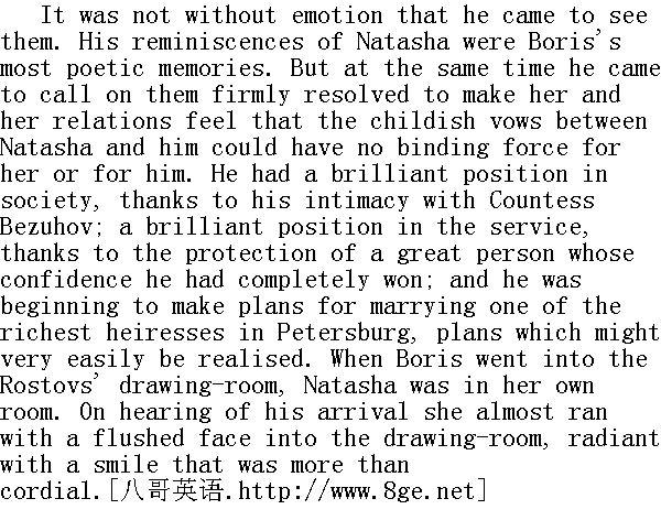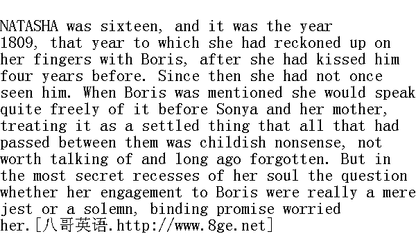 娜塔莎年方十六岁, 时值一八○九年, 正是她和鲍里斯在四年前接吻以后屈指数到的那年。从那时起她一次也没有看见鲍里斯。当话题涉及鲍里斯时, 就像提起一件已经决定了的事情, 她在索尼娅和母亲面前很随便地谈到这一切往事无非是孩子气的举动, 不值得启齿, 老早就遗忘了。但是在她那隐秘的灵魂深处, 她对鲍里斯作出的保证是否是戏言, 还是紧要的、具有约束力的诺言, 这个问题一直使她觉得难受。 Ever since Boris had left Moscow in 1805 to go into the army he had not once seen the Rostovs. Several times he had been in Moscow, and in travelling had passed not far from Otradnoe, but he had not once been at the Rostovs'. 自从一八○五年鲍里斯从莫斯科去参军以来, 他就未曾和罗斯托夫一家人会面。他有几次从离奥特拉德诺耶不远的地方经过, 回到莫斯科, 但是一回也没有到罗斯托夫家里去。 It had sometimes occurred to Natasha that he did not want to see her, and her surmises had been confirmed by the mournful tone in which he was referred to by her elders. 娜塔莎有时想到, 他不愿意看见她, 长辈在谈到他时常用的忧愁的语调, 证实了她的猜测。 "Old friends are soon forgotten nowadays," the countess would say after Boris had been mentioned." 当今之世没有人会想念老朋友。"伯爵夫人在有人提到鲍里斯之后接着这样说。 Anna Mihalovna had taken in these latter days to seeing less of the Rostovs. There was a marked dignity, too, in her manner with them, and she spoke on every occasion with thankfulness and enthusiasm of her son's great abilities and brilliant career. When the Rostovs arrived in Petersburg Boris came to call on them. 安娜·米哈伊洛夫娜迩来较少地到罗斯托夫家里去, 不知何故她的举止也特别庄重, 她每次都兴奋地、感激地谈到她儿子的长处以及他的锦绣前程。当罗斯托夫一家人来到彼得堡时, 鲍里斯便去访问他们。