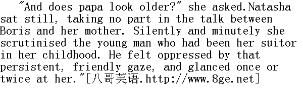 他的心情不无激动地走到他们那里去。鲍里斯对娜塔莎的想念是最富有诗意的。而与此同时, 他在途中就怀有坚定的意图, 要让她和她的父母明确地意识到, 他和娜塔莎的童年时代互相许下的诺言, 无论是对他, 还是对她, 都不可能是必须履行的义务。他因与伯爵夫人别祖霍娃有密切关系, 所以他在社会上的处境十分美满, 又因他有一位要人庇护他, 所以他的职位十分显赫, 他完全博得这位要人的信任, 他于是打算娶一个彼得堡的最富有的及笄的姑娘, 他的这种打算在当时是很容易实现的。当鲍里斯走进罗斯托夫家的客厅时, 娜塔莎正在她自己房里。她知道他的到来之后, 满面通红, 喜气洋洋, 流露出过分亲热的微笑, 几乎是跑着走进客厅里去。 Boris had thought of Natasha as the little girl he had known four years before in a short frock, with black eyes glancing under her curls, and a desperate, childish giggle; and so, when a quite different Natasha came in, he was taken aback and his face expressed surprise and admiration. His expression delighted Natasha. 鲍里斯记得四前他认识的娜塔莎, 那时她穿着短短的连衣裙, 长着一对乌黑的、从卷发下面闪闪发亮的眼睛, 可以听见她的无所顾忌的孩子气的笑声, 因此, 在这个完全不同的娜塔莎走进来的时候, 他觉得腼腆起来, 他的脸上显示出喜悦和惊奇。他这种脸部表情使娜塔莎感到高兴。 "Well, would you know your mischievous little playmate?" said the countess. Boris kissed Natasha's hand, and said he was surprised at the change in her." 怎么, 你认得你的淘气的小女朋友么?"伯爵夫人说。鲍里斯吻吻娜塔莎的手, 并且说, 她身上发生的变化使他感到惊讶。 "How pretty you have grown!"" 您比以前好看多了!" "I should hope so!" was the answer in Natasha's laughing eyes." 当然!"娜塔莎的发笑的眼睛答道。