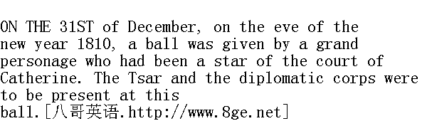 十二月三十一日, 即是一八一○年元旦的前夜, le reveillon①, 叶卡捷琳娜二世时代的一名大官举办舞会。外交使团的官员和国王都要来参加舞会。 ①法语: 前夜(除夕)。 The well-known mansion of this grandee in the English Embankment was illuminated by innumerable lights. The police were standing at the lighted entry, laid with red baize; and not merely policemen, but a police commander was at the entrance, and dozens of officers of the police. Carriages kept driving away, and fresh ones kept driving up, with grooms in red livery and grooms in plumed hats. From the carriages emerged men wearing uniforms, stars, and ribbons; while ladies in satin and ermine stepped carefully out on the carriage steps, that were let down with a bang, and then walked hurriedly and noiselessly over the baize of the entry. 在英吉利沿岸街上, 遐迩闻名的大官的楼房被无数彩灯映照得灿烂辉煌。警察站在被照得通明的、铺有红呢绒地毯的台阶上, 在这里站岗的不仅有宪兵, 而且有警察局长和数十名警官。许多辆轻便马车开出去, 又有许多辆开到门口, 轻便马车上载有一些穿红色制服或戴着羽饰帽子的仆役。一些身穿制服、佩戴星形勋章和绶带的男人从四轮轿式马车中走出来, 一些身穿缎子衣裳和银鼠皮袄的女士小心翼翼地沿着哗啦一声放下来的踏板走下来, 之后再沿着台阶上的红呢地毯急促地、不出声地走过去。 Almost every time a new carriage drove up, a whisper ran through the crowd and hats were taken off. "The Emperor?...No, a minister...prince...ambassador...Don't you see the plumes?..." was audible in the crowd. One person, better dressed than the rest, seemed to know every one, and mentioned by name all the most celebrated personages of the day. 几乎每当一辆四轮轿式马车开到门口, 人群中就会传来一阵低语声, 人们都脱下自己的帽子。"国王吗?......不是, 大臣......亲王......公使......你难道看不见羽饰吗?......"可以听见人群中的说话声。人群中有个穿着最讲究的人似乎认识所有的人, 喊得出当时最著名的达官贵人的名字。 A third of the guests had already arrived at this ball, while the Rostovs, who were to be present at it, were still engaged in hurried preparations. 三分之一的客人均已前来出席这次舞会, 必须出席舞会的罗斯托夫一家, 却正忙于整装待发。