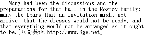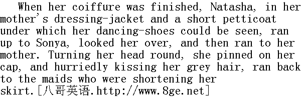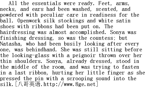 罗斯托夫一家人对这次舞会发表许多议论, 作了许多准备, 他们对此事过多地担心, 害怕得不到请帖, 害怕服装办不齐全, 害怕安排不好务必安排的一切。 The Rostovs were to be accompanied by Marya Ignatyevna Peronsky, a friend and relation of the countess, a thin and yellow maid-of-honour of the old court, who was acting as a guide to the provincial Rostovs in the higher circles of Petersburg society. 玛丽亚·伊格纳季耶夫娜·佩龙斯卡娅随同罗斯托夫一家人出席舞会, 她是伯爵夫人的友人和亲戚, 是旧朝中的一个面黄肌瘦的宫廷女宫, 又是外省人罗斯托夫之家在彼得堡上流社会的引路人。 At ten o'clock the Rostovs were to drive to Tavritchesky Garden to call for the maid-of-honour. Meantime it was five minutes to ten, and the young ladies were not yet dressed. 晚上十点钟罗斯托夫一家人要到道利达花园去寻找宫廷女官, 可是到十点只差五分钟了, 小姐们都还没有着好衣裳。 Natasha was going to her first great ball. She had got up at eight o'clock that morning, and had spent the whole day in feverish agitation and activity. All her energies had since morning been directed to the one aim of getting herself, her mother, and Sonya as well dressed as possible. Sonya and her mother put themselves entirely in her hands. The countess was to wear a dark red velvet dress; the two girls white tulle dresses over pink silk slips, and roses on their bodices. They were to wear their hair a la grecque. 娜塔莎生平第一次出席大型舞会。是日早晨八点钟, 她就起床, 整天价处于激动不安和忙乱的状态。从清早起, 她就集中全部精力去办一件事, 使她们: 她自己、妈妈、索尼娅--都穿着得十分讲究。索尼娅和伯爵夫人完全靠她来照料。伯爵夫人要穿一件紫红色的丝绒连衣裙, 她们俩人穿玫瑰色绸子衬裙, 罩着白色的薄纱连衣裙, 硬腰带上佩戴玫瑰花。发型要做成a la greeque①。 ①法语: 希腊式。