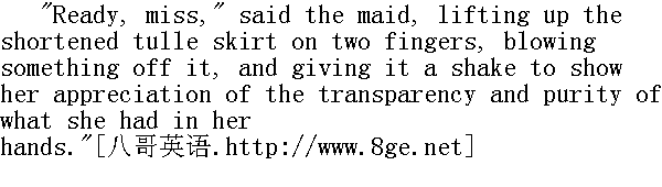 小姐, 搞好了。"侍女一面说, 一面用两个指头举着一件缘上边的薄纱连衣裙, 对着它吹拂几下, 抖几下, 用这个动作让人意识到, 她手中提的东西是薄纱的, 是干净的。 Natasha began putting on the dress. 娜塔莎开始穿连衣裙了。 "In a minute, in a minute, don't come in, papa," she shouted to her father at the door, from under the tulle of the dress that concealed all her face. Sonya slammed the door. A minute later the count was admitted. He was wearing a blue frock coat, stockings, and dancing-shoes, and was perfumed and pomaded." 爸爸, 别进来, 马上搞好了, 马上搞好子。"她从蒙住她的整个面孔的薄纱裙底下对着打开房门的父亲喊道。索尼娅砰然一声关上门。一分钟以后他们让伯爵进来。他穿着一件蓝色燕尾服, 长袜子和矮靿皮鞋, 喷了香水, 用发蜡把头发抹平了。 "Ah, papa, how nice you look, lovely!" said Natasha, standing in the middle of the room, stroking out the folds of her tulle." 啊, 爸爸, 你多么漂亮, 真好看!"娜塔莎说, 她站在房间正中央, 弄平薄纱的皱褶。 "If you please, miss, if you please..." said a maid, pulling up the skirt and turning the pins from one corner of her mouth to the other with her tongue." 等一等, 小姐, 等一等。"女仆跪着说, 一面抻平整衣裙, 一面用舌头把大头针从一边嘴角移到另一边嘴角。