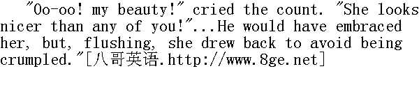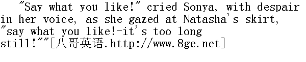 嘿, 我的美人儿!"伯爵大声喊道。"她比你们大家都更漂亮!......"他想搂抱她, 但她满面通红, 闪到一边去, 省得弄皱她的连衣裙。 "Mamma, the cap should be more on one side," said Natasha. "I'll pin it fresh," and she darted forward. The maids turning up her skirt, not prepared for her hasty movement, tore off a piece of the tulle." 妈妈, 把直筒帽子戴歪一点, "娜塔莎说。"我用针来给您别好, "她猛然向前奔跑, 正在缘衣边的女仆们来不及跟在她身后迅跑, 扯下了一小块薄纱。 "Oh, mercy! What was that? Really it's not my fault..."" 我的上帝!这是怎么一回事!我真的没有出差错......" "It's all right, I'll run it up, it won't show," said Dunyasha." 没关系啊, 我来缭上几针, 就会看不出来的。"杜尼亚莎说。 "My beauty, my queen!" said the old nurse coming in at the doorway. "And Sonyushka, too; ah, the beauties!..."" 美人儿, 我的美女啊!"从门外走进来的女保姆说, "索尼娅, 啊, 这些美人儿!......"