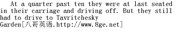 十点一刻钟他们终于坐上了四轮轿式马车, 动身了。但是还是要顺路到道利达花园去一趟。 Madame Peronsky was ready and waiting. In spite of her age and ugliness, just the same process had been going on with her as with the Rostovs, not with flurry, for with her it was a matter of routine. Her elderly and unprepossessing person had been also washed and scented and powdered; she had washed as carefully behind her ears, and like the Rostovs' nurse, her old maid had enthusiastically admired her mistress's attire, when she came into the drawing-room in her yellow gown adorned with her badge of a maid-of-honour. Madame Peronsky praised the Rostovs' costumes, and they praised her attire and her taste. Then, careful of their coiffures and their dresses, at eleven o'clock they settled themselves in the carriages and drove off. 佩龙斯卡娅已经打扮好了。虽然她衰老而且丑陋, 但是她的做法却和罗斯托夫之家一样;虽然她做起事来没有那样匆忙(这对她来说是一桩习以为常的事), 但是她那老年人的难看的身体却也喷了香水, 扑了香粉, 盥洗得很干净, 耳朵背后也尽量洗得一尘不染, 就像在罗斯托夫家里一样, 当她穿着一件绣有花字的黄色连衣裙走到客厅的时候, 那个年老的侍女甚至也乐于欣赏她这位太太的服装。佩龙斯卡娅夸奖罗斯托夫之家的打扮。罗斯托夫一家人称赞她的鉴赏力和穿着, 此外她们留意着自己的发型和衣裙, 十一点钟都在四轮轿式马车上, 分别就坐, 启行了。